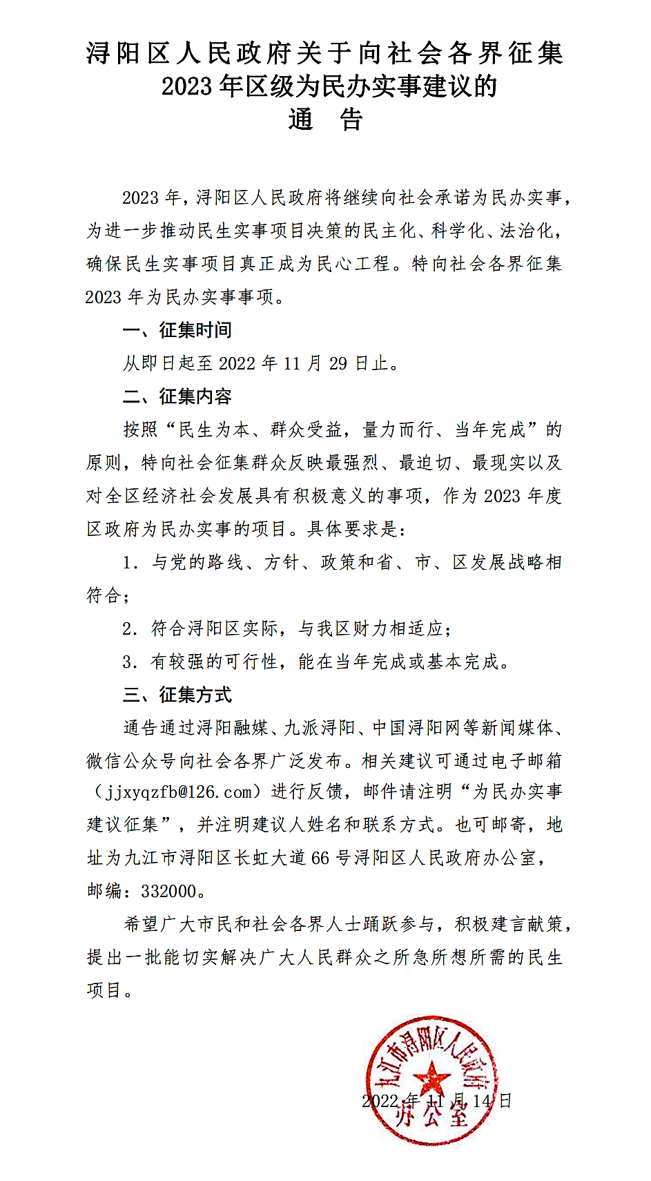 【社会征集】浔阳区人民政府关于向社会各界征集2023年区级为民办实事建议的通告