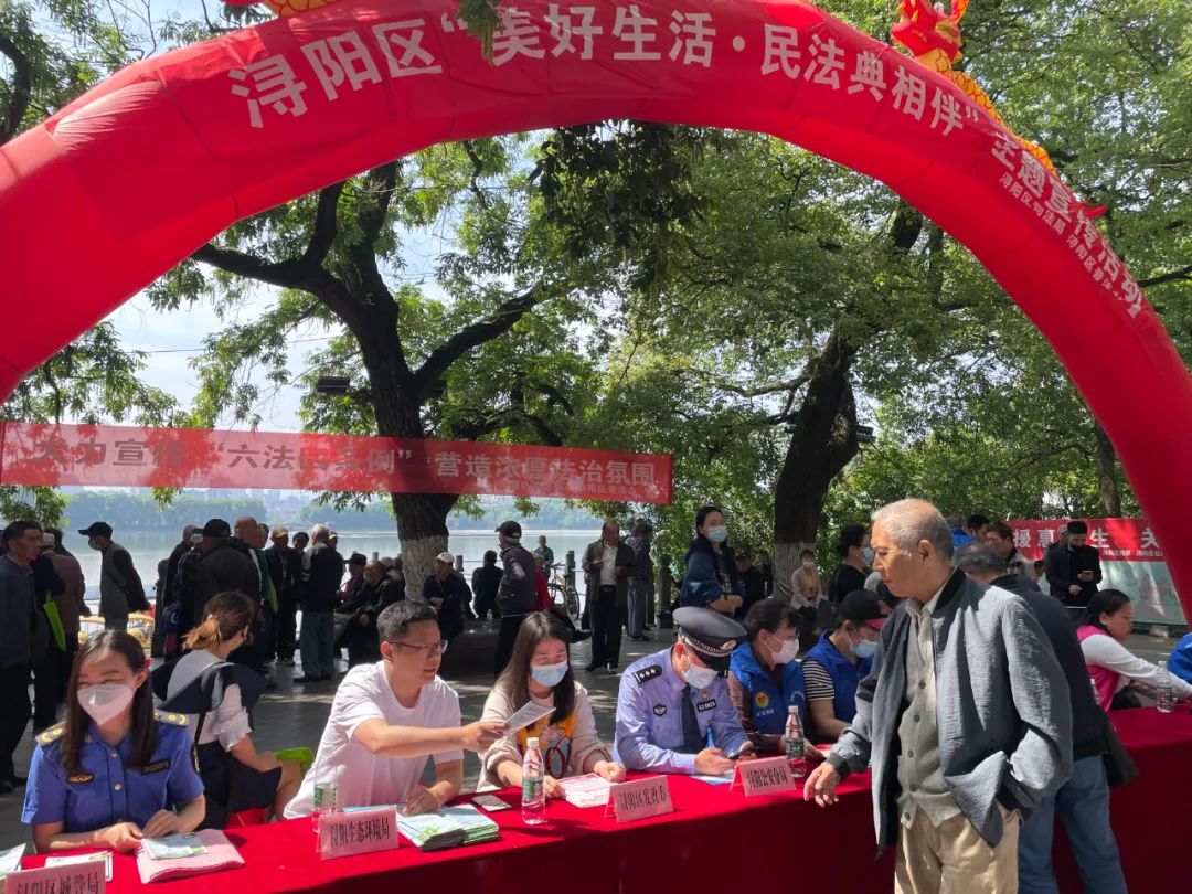 5月17日上午,九江市浔阳生态环境局联合区司法局、区民政局、区城管、区妇联、浔阳公安分局,在烟水亭广场开展以“美好生活•民法典相伴”为主题的普法宣传活动,为广大群众宣讲并普及生态环保相关知识与法律法规,增强群众环保法律意识,营造浓厚的环保法治氛围。