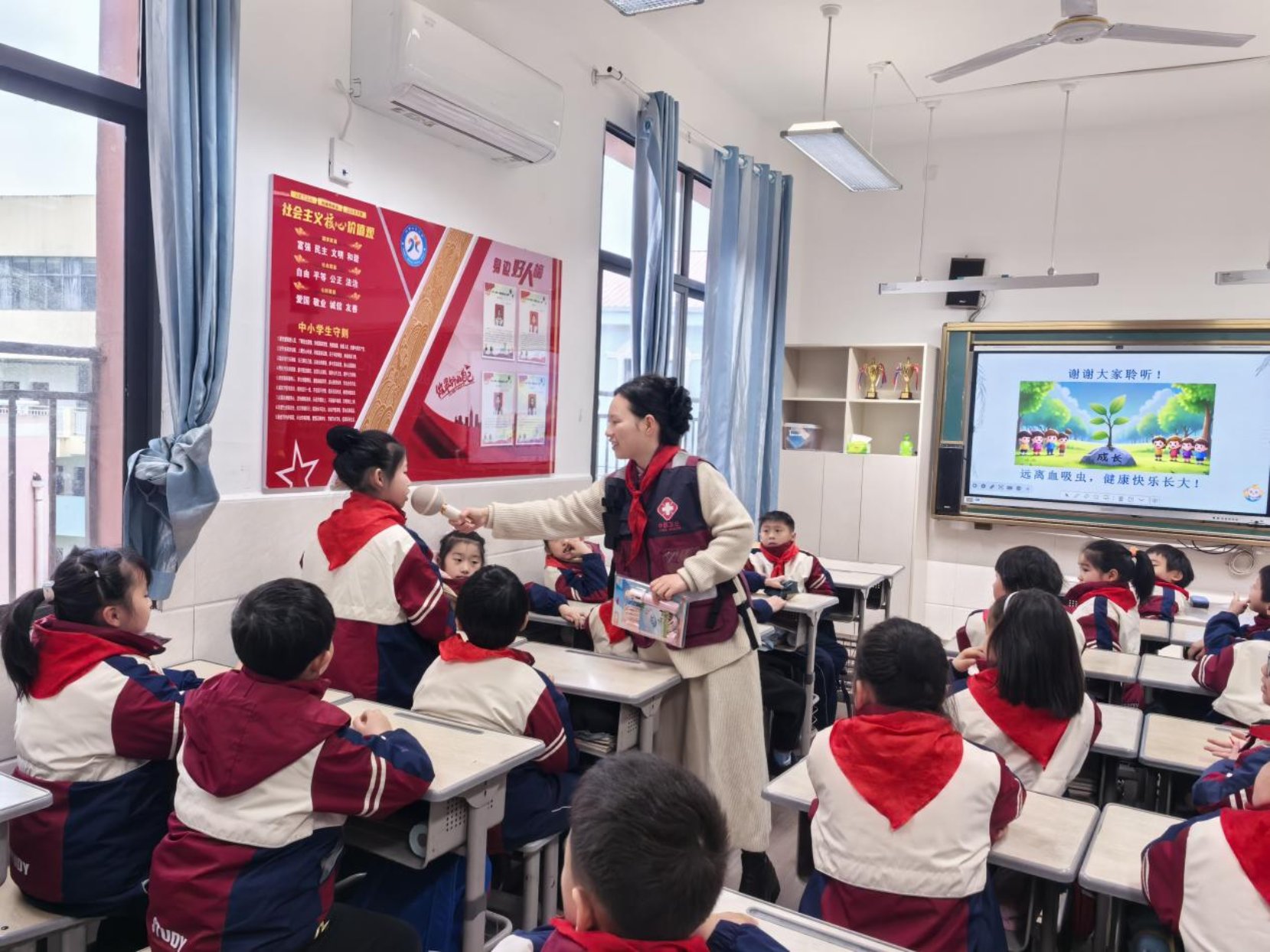 针对血吸虫感染的高发特点,工作人员特别提醒同学们,每年4-10月夏秋季是尾蚴最活跃的时期,野外的小河、湖泊、池塘等不明水域都是危险区域,这段时间要格外提高警惕。围绕核心防护要点,工作人员向孩子们传授了“三个超简单防护妙招”:坚决不碰野外脏水、野水;若必须接触水源,一定要穿雨鞋、戴手套做好物理防护;如果不慎接触野水后出现身体不适,要第一时间告诉爸爸妈妈并及时就医检查。为了方便孩子们记忆,工作人员还带领大家一起朗读血防小口诀:“血吸虫,藏水中,钉螺是它小家中;尾蚴钻皮会生病;不碰野水最管用!”朗朗上口的口诀让血防知识入脑入心,现场互动问答环节中,同学们积极举手、踊跃作答,在思考和回应中进一步巩固了所学知识。