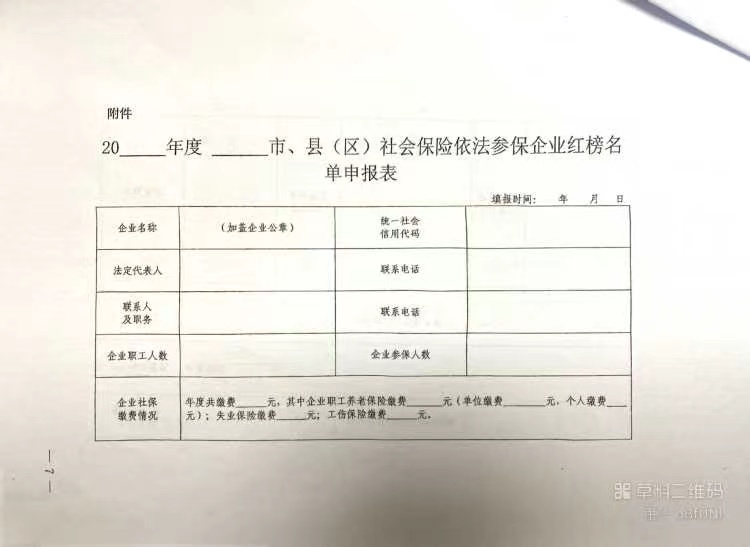 1、“20_年度__市、县(区)社会保险企业参保红榜申报表”(见附件)