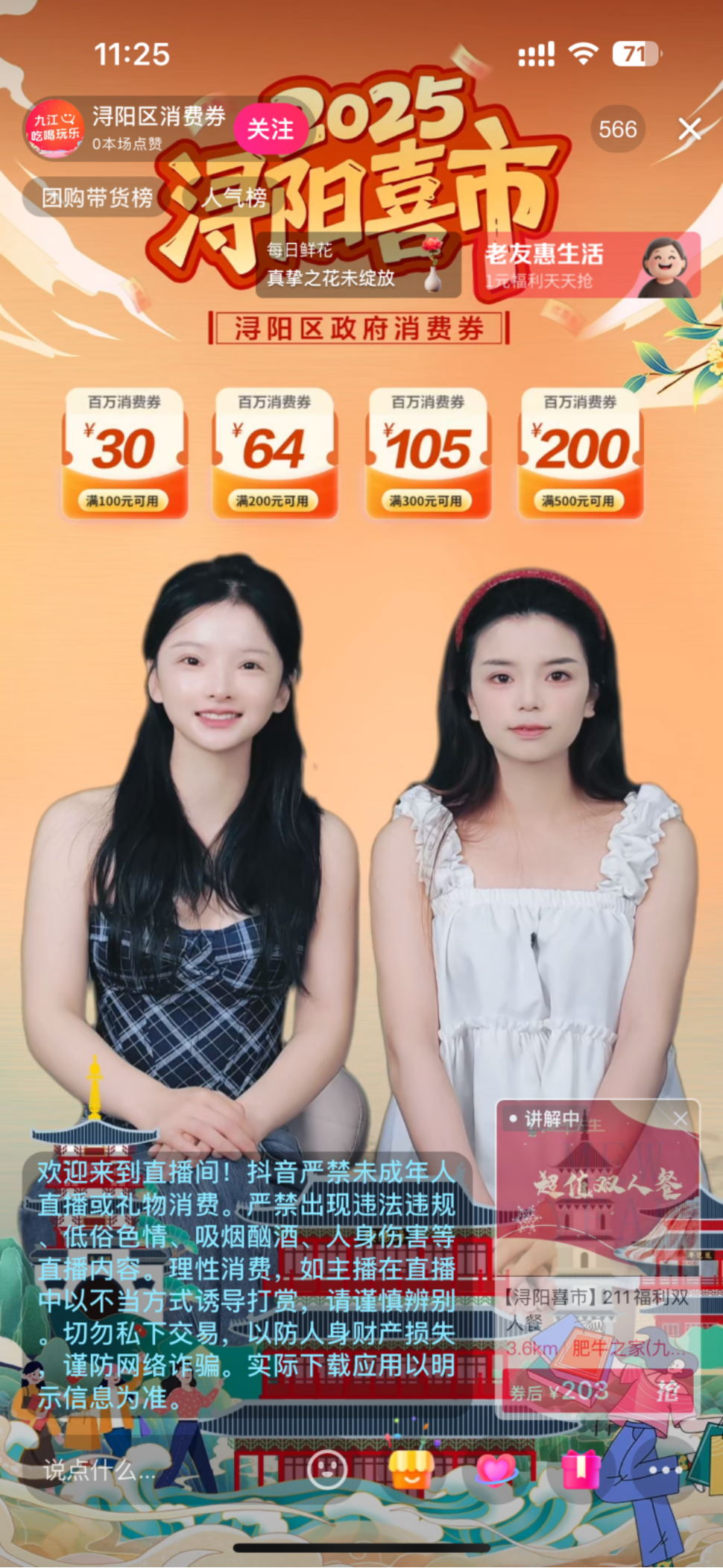 本次活动集结了九江市浔阳区内热门门店,6月20日至6月30日,在九江市浔阳区消费皆可享受该补贴。消费者抖音搜索浔阳区消费券进入活动会场领券,或者进入“浔阳区消费券”官方直播间或抖音团购POI地址页面,根据主播提示或点击抖音商家团购页面,即可领取满100元减30元、满200元减64元、满300元减105元、满500元减200元的消费券。
