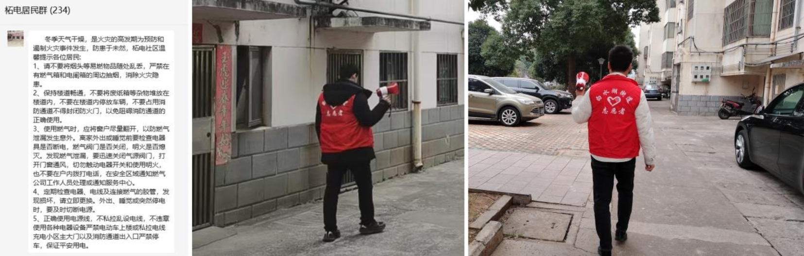 一、加强消防安全宣传。首先,柘电社区利用电子屏、微信群等,提醒居民在生活中需注意的消防安全事项;其次,柘电社区在辖区内用小喇叭播放烟花爆竹禁燃禁放,并进行用电、用气安全知识宣传,从而提高辖区居民的防火意识,使防火观念深入人心。