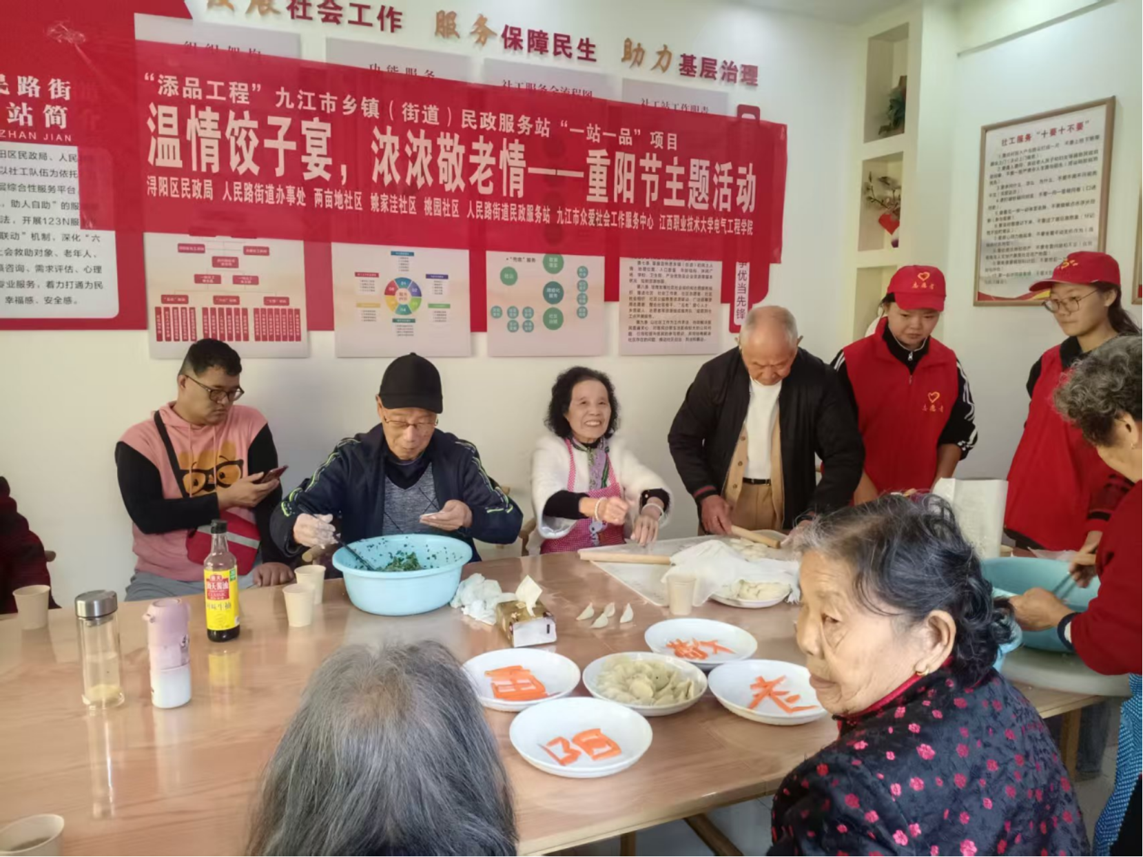 两亩地社区、姚家洼社区、桃园社区、人民路街道民政服务站、江西职业技术大学电气工程学院等单位,联合开展“温情饺子宴,浓浓敬老情”为主题的重阳节活动,为辖区老人、退役军人老兵等送上节日的温暖与关怀。