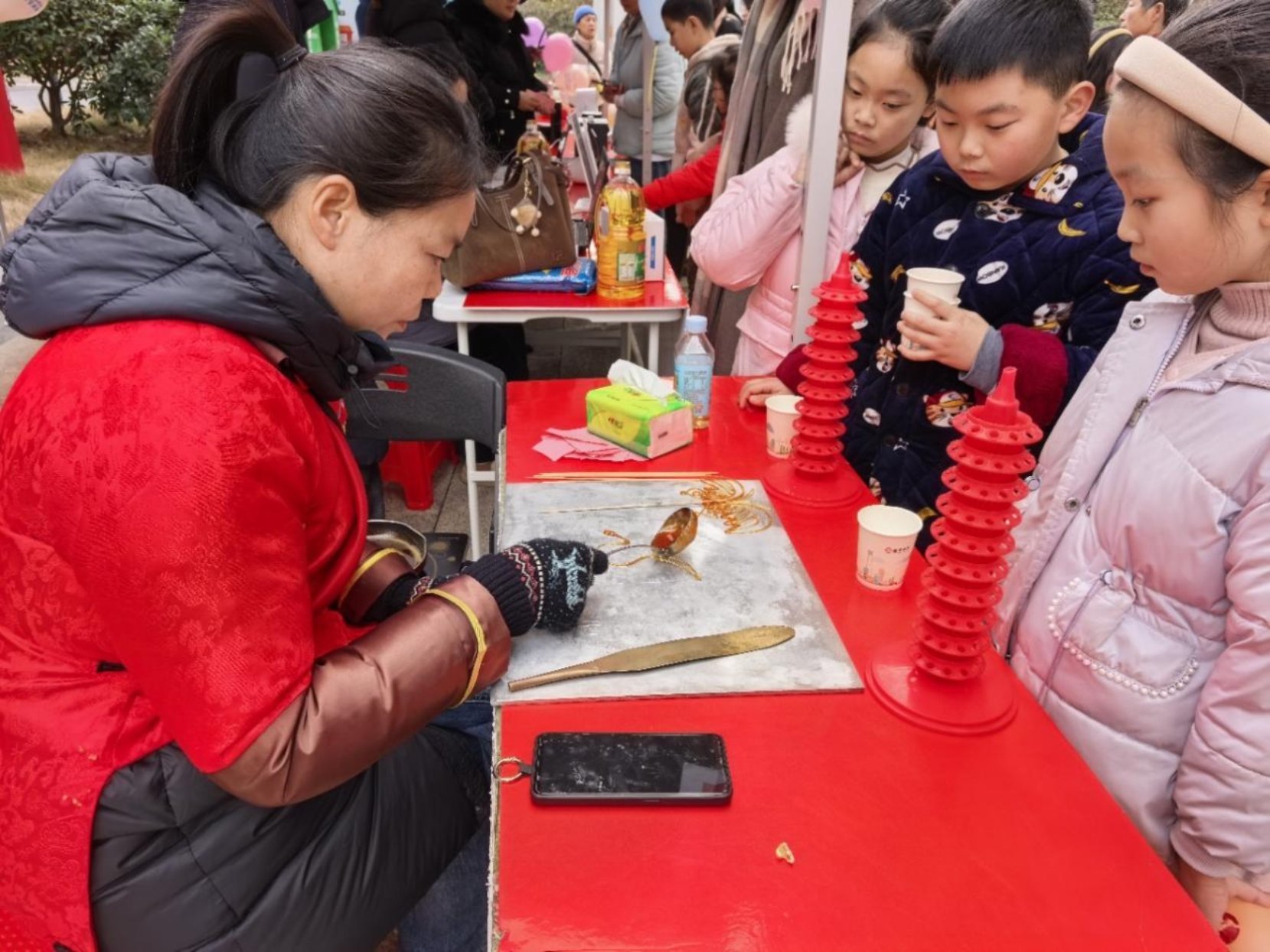 糖画点位人气爆棚,成为孩子们的欢乐天地。糖画师傅手持融化的糖浆,手腕轻转,勾勒出龙凤、小动物及“福”“喜”等吉祥造型,晶莹灵动的糖画承载着童年回忆,孩子们踮脚围观、细心珍藏,大人们驻足拍照,甜蜜氛围弥漫现场。冰糖葫芦、爆米花也深受喜爱,大人小孩边吃边聊,暖意融融。