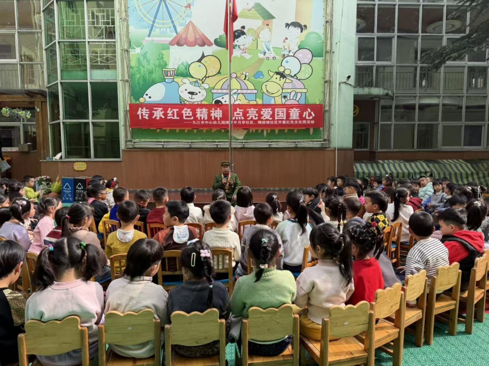 为厚植青少年爱国主义情怀,传承红色基因,赓续革命精神,3月25日上午,湓浦街道半月亭社区、梅绽坡社区联合九江市中心幼儿园开展传承红色精神点亮爱国童心主题红色宣讲活动。活动特邀退伍老兵赵春金担任主讲,以亲身经历为鲜活教材,为九江市中心幼儿园的小朋友们带来一堂生动深刻的爱国主义教育课。