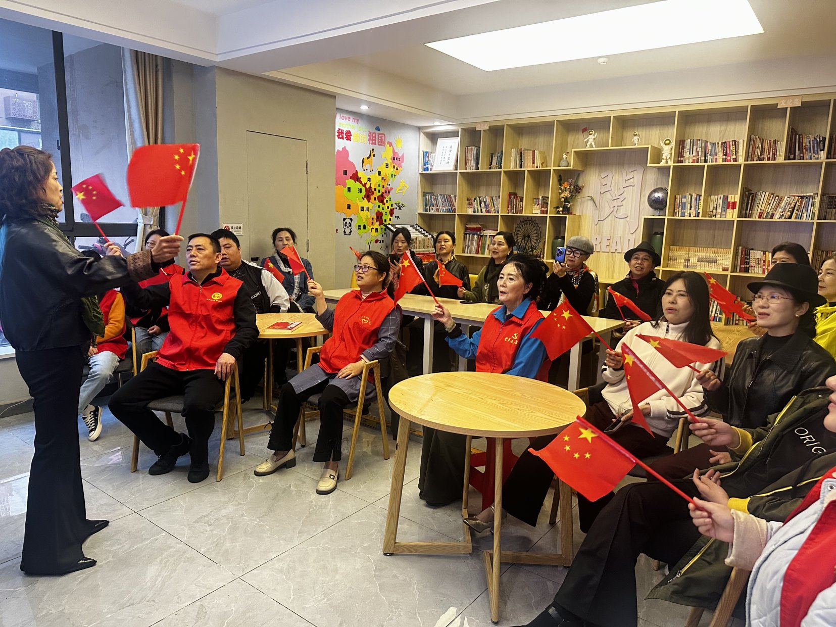 随后,社区党员志愿者走到台前,带领大家共同诵读了红色经典名篇——《谁是最可爱的人》。伴随着铿锵有力的朗读声,抗美援朝战场上的烽火岁月仿佛重现眼前,志愿军战士们不畏牺牲、保家卫国的光辉形象跃然纸上。大家在诵读中重温那段波澜壮阔的历史,深切感悟革命先辈们炽热的爱国情怀,从中汲取赓续前行的精神力量。活动的最后,激昂的旋律响起,全场人员手持国旗,齐声高唱《我的祖国》。“一条大河波浪宽,风吹稻花香两岸……”悠扬而坚定的歌声在会场内回荡,唱出了对伟大祖国的无限热爱与祝福,将整场活动的氛围推向了最高潮。