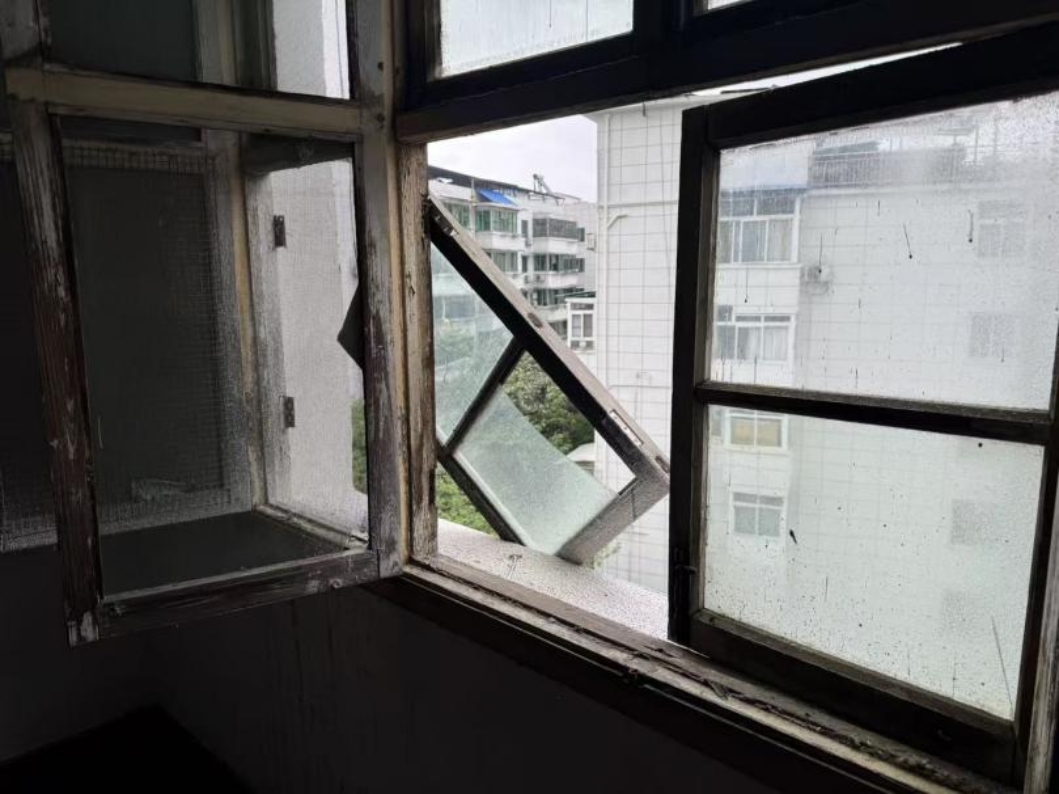 4月22日下午,社区工作人员开展老旧小区日常安全巡查时,发现某老旧小区7楼一户居民家中窗户出现脱落迹象。经现场核查,该窗户框架松动、部分玻璃与墙体连接处已脱离,仅靠少量连接件勉强固定;加之近期九江地区多雨多风,窗户随时可能整体坠落,其下方为居民日常通行要道,存在极大高空安全隐患,严重威胁过往居民人身安全。