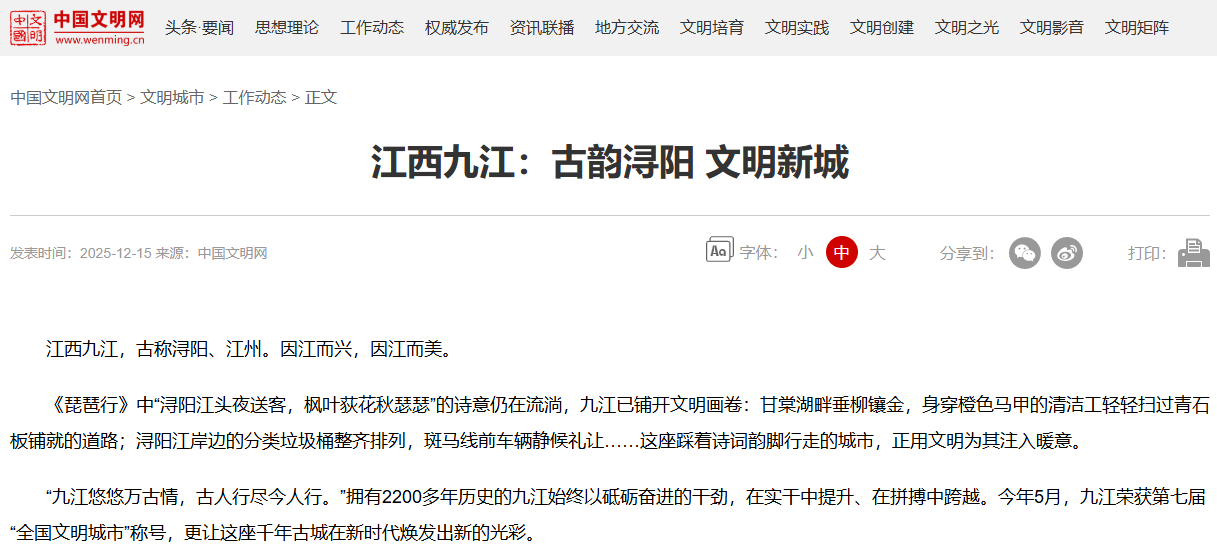 从照亮一盏灯到畅通一条路,从增加一个车位到拓展一片绿地,九江正用实打实的改变,书写更有温度、更具质感的民生答卷。如今,九江正在中心城区发起“人人都是形象,处处体现文明”的城市文明建设行动,推进从“创建文明城市”向“建设城市文明”的华丽转身,让文明之花在九江大地持续绚烂绽放。