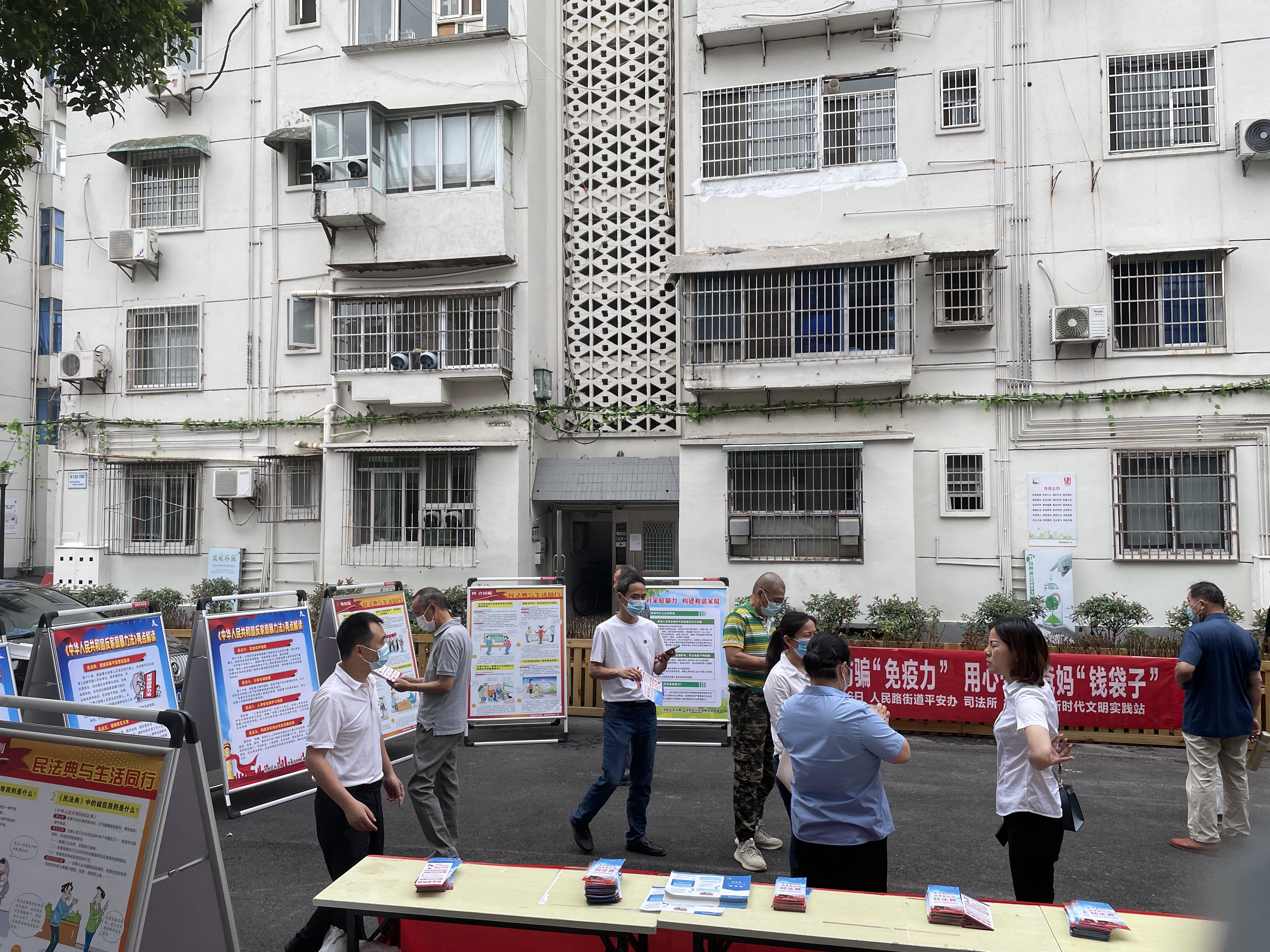 当日活动现场人头攒动,志愿者通过设置宣传台、摆放展板、悬挂宣传横幅、发放宣传材料、开展法律咨询等方式,开展《民法典》宣传,引导居民学会运用法律解决问题的能力
