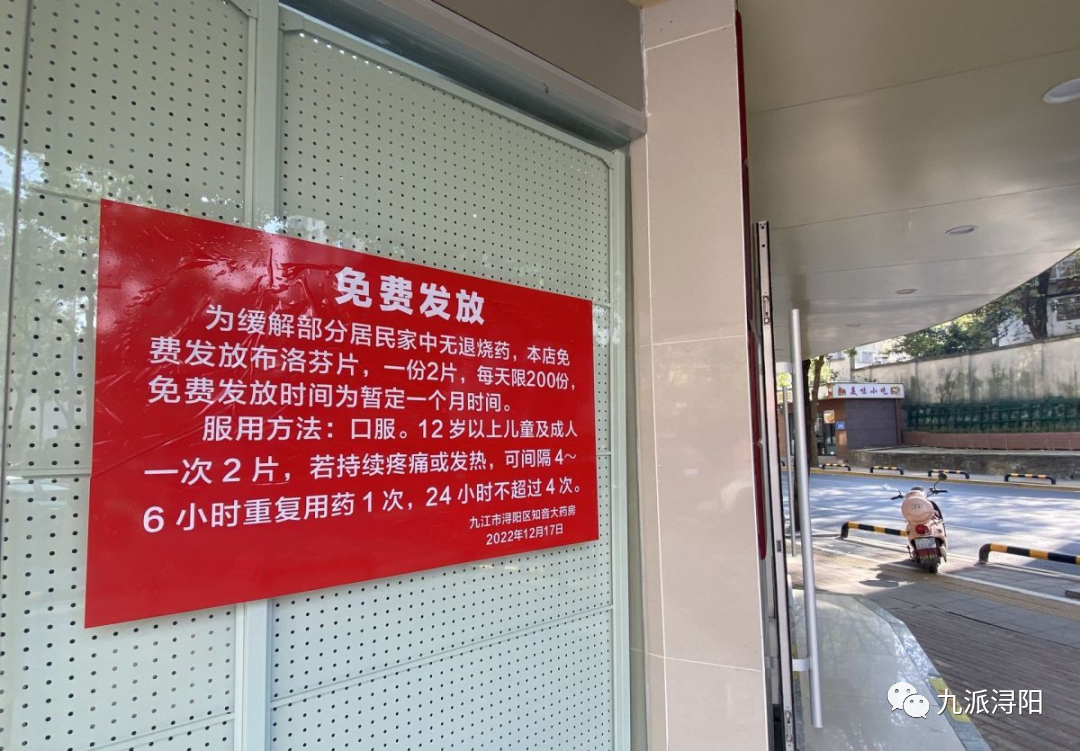 这家位于浔阳区的药房在店面的显眼位置贴上了《免费发放》的通告:“为缓解部分居民家中无退烧药,本店免费发放布洛芬片,一份2片,每天限200份……”随后记者找到了该药房。药房负责人肖晨星介绍说,他们从一周前开始免费送药,至今已经发了3000多片。