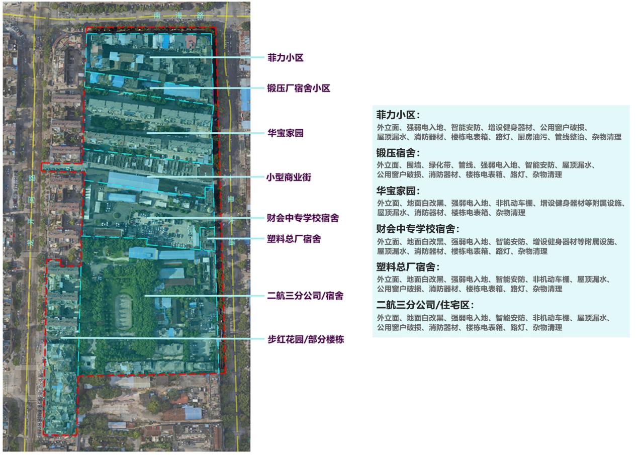 项目总规划面积约6.8万平方米,合103.07亩,包含菲力小区、锻压厂宿舍、华宝家园、财会中专学校宿舍、塑料总厂宿舍、二航三分公司宿舍、步红广场、步红金桂苑,涉及70余栋房屋、980户居民,改造内容包括外立面及外墙修复、楼道内墙及扶手修复、楼道照明改造、楼道消防设施改造、管线规整、场地道路白改黑、局部景观及绿地提升、新建开放性社区活动场地、新建公共服务配套设施、新建非机动车棚、新建及修复场地排水沟、停车位规划,完善并增设片区内所需的照明设施、楼道烟感设施、生活配套设施、安全护栏设施、休闲健身设施、小区强弱电下地等内容。