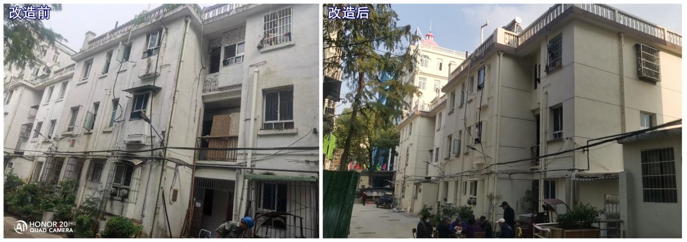 六是对建筑外立面及楼道内墙进行修复,根据不同程度的老旧建筑制定修复及饰面方式,并更换老旧晾衣架、雨棚等设施,提升小区整体空间环境,解决外立面突出物的安全隐患。