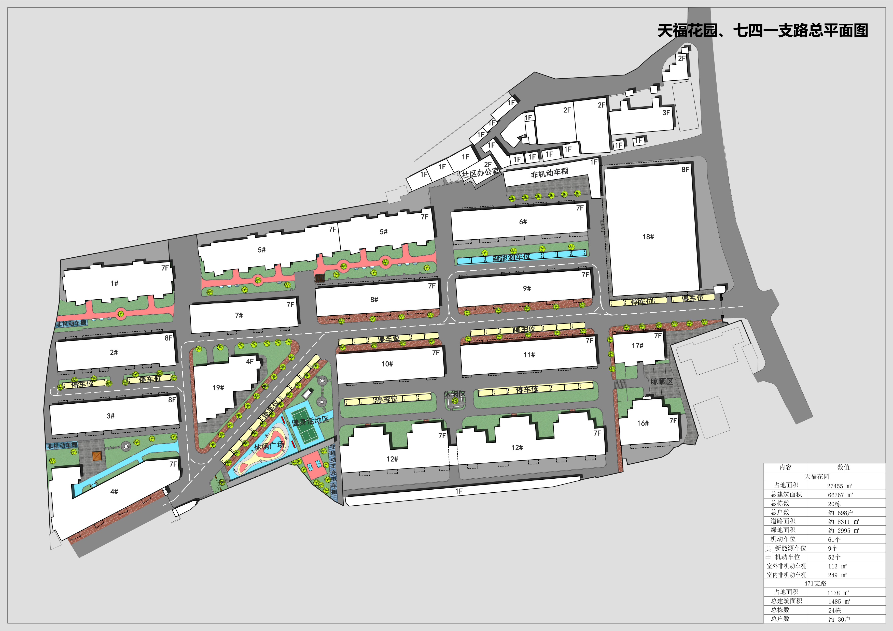 浔阳区人民路街道天福花园片区老旧小区改造项目位于浔阳区人民路街道幸福里社区天福花园片区,位于长虹大道以北、十里大道以东,人民路以西。该项目总投资约2459万元,占地面积约53.4亩,共计改造建筑30栋,涉及居民868户,建筑面积8.98万平方米。改造主要内容包括地面白改黑、增设垃圾搜集点、建筑立面改造建筑屋顶改造、建筑楼宇对讲和楼梯间单元门改造、增设非机动车棚、增加机动车车位、小区健身休闲广场改造、油烟机窗改造、室外景观改造、室外路灯等部分亮化改造、小区内部道路改造、小区安防系统改造等。