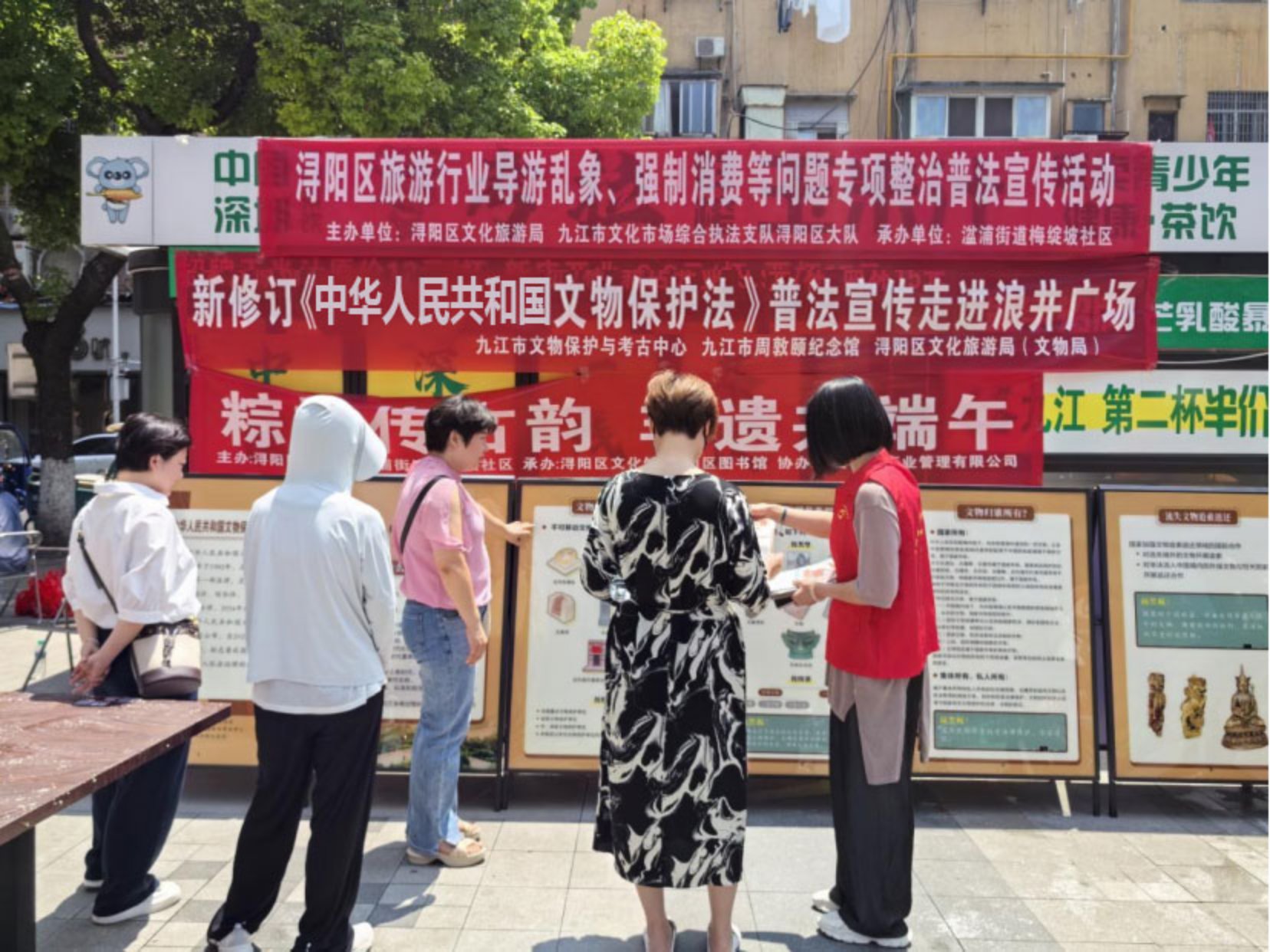 此次活动由九江市文物保护与考古中心、九江市周敦颐纪念馆、浔阳区文化旅游局、浔阳区文物局共同组织策划,旨在深入贯彻落实新修订的《中华人民共和国文物保护法》以及第四次文物普查宣传,让更多市民了解文物保护的重要性和法律责任,营造全社会共同参与文物保护的良好氛围。活动现场,工作人员通过设置宣传展板、发放宣传资料、提供法律咨询等多种形式,向过往市民详细解读新修订《中华人民共和国文物保护法》的亮点内容和重要意义。