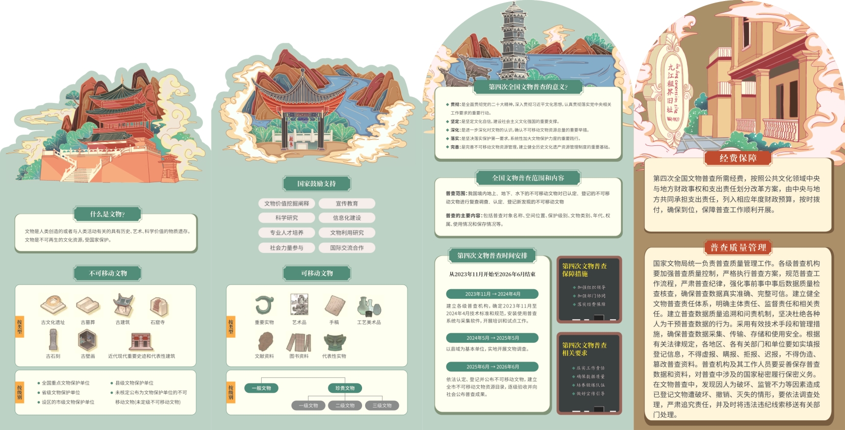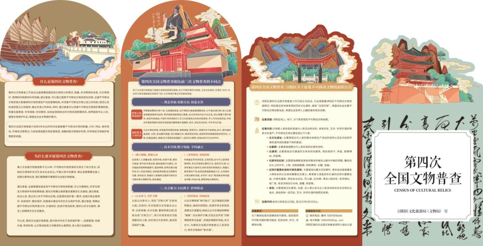 此次推出的系列宣传折页不仅聚焦群众最关心的文保问题,而且还有当前正在开展的第四次全国文物普查工作,内容设计全面且精准。折页的第一个系列是解读四普的意义、范围、内容以及浔阳区关于征集不可移动文物线索的公告等内容,让群众摸清文物家底、传承历史文化的重要性,了解普查工作的必要性,提高对普查工作的配合度。