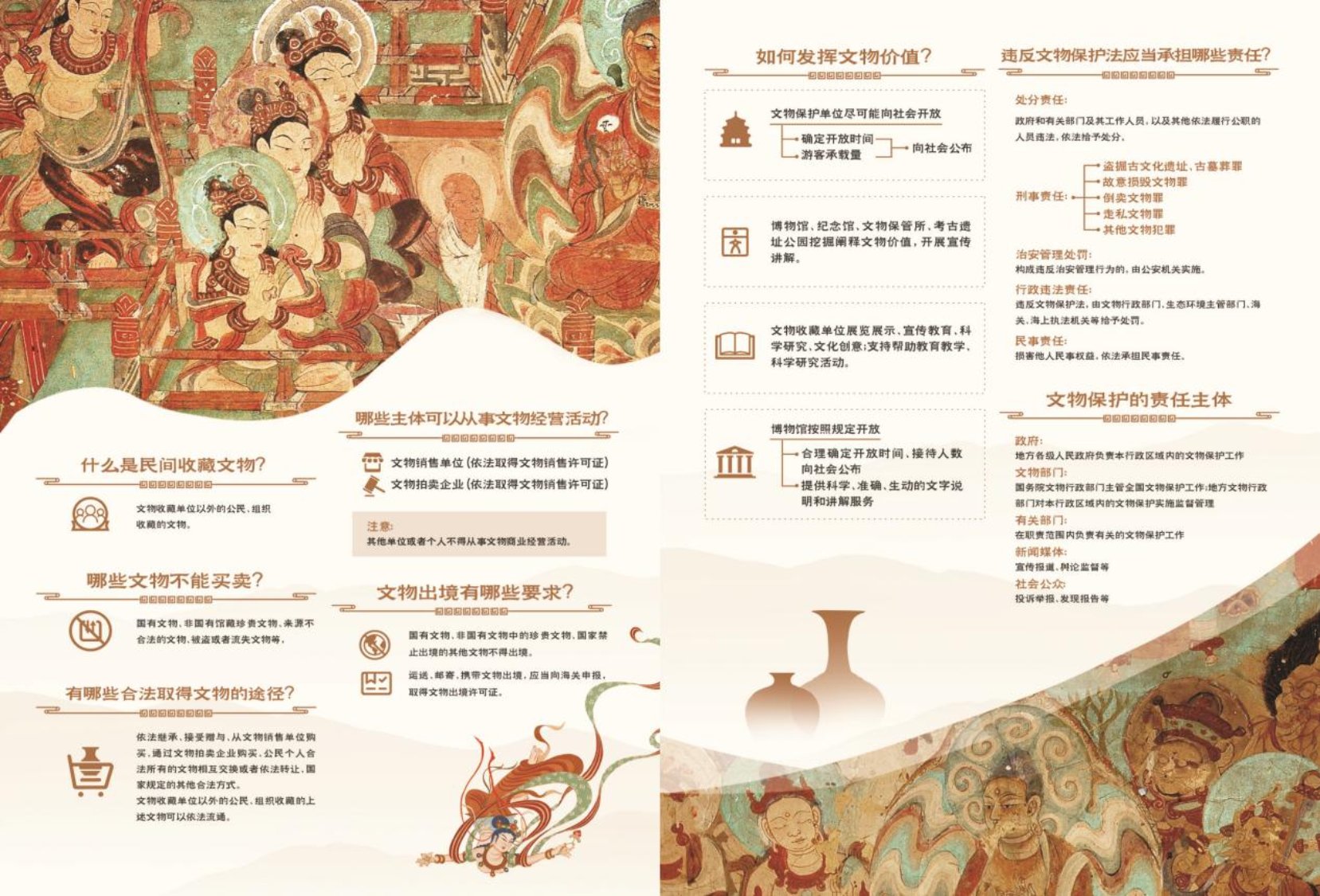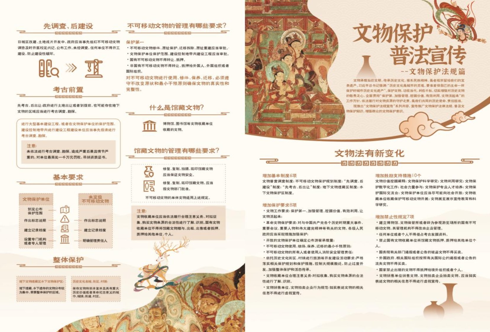 第二个系列则针对“什么是文物”“可移动文物与不可移动文物的区别”进行了清晰界定,用通俗语言打破专业术语壁垒,让普通群众能快速理解文物的概念范畴。针对文物保护普法需求,折页专门设置普法板块,重点解读文物保护相关法律法规,明确破坏文物的法律后果,强化群众的法律意识。