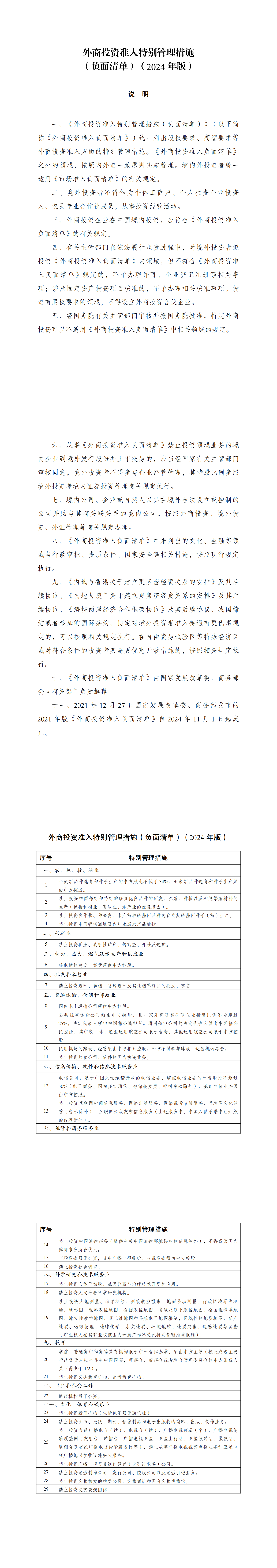 《外商投资准入特别管理措施(负面清单)(2024年版)》