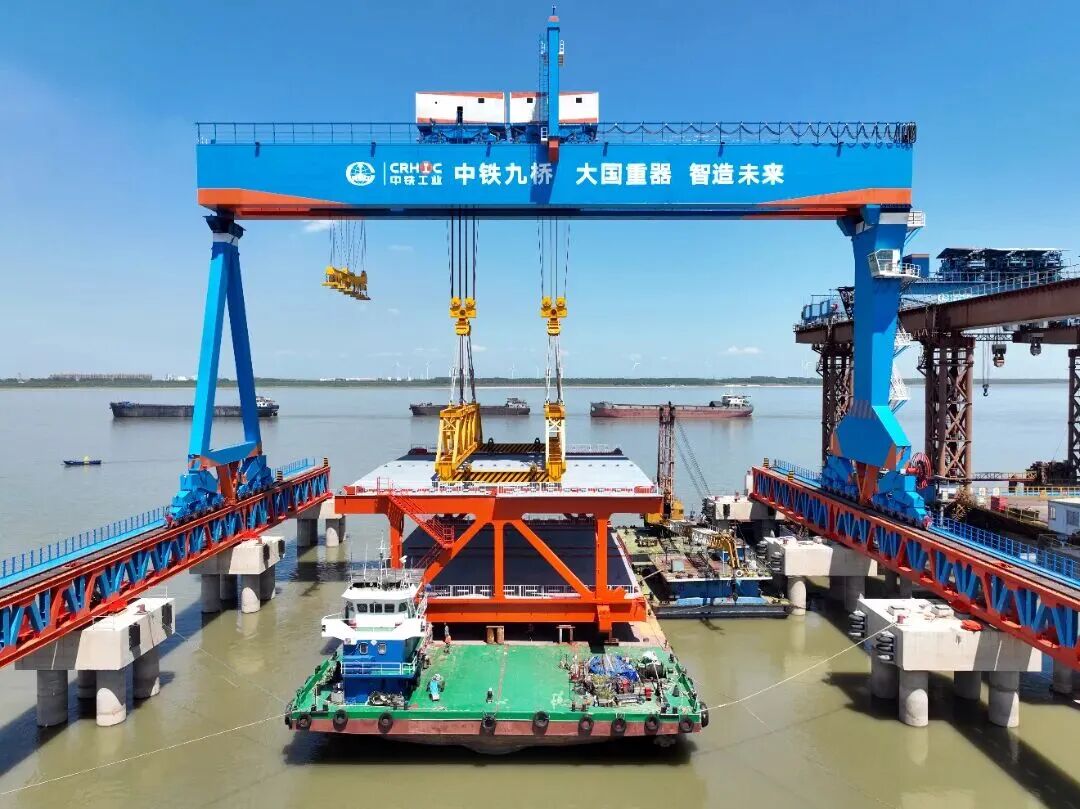 如今的中铁九桥重件码头,巨型吊机昂首挺立,大件构件平稳起吊、高效转运,单件起重能力升至2000吨,停泊能力达5000吨级,一跃成为长江中游单件起重能力最大的重件码头,可强力保障九江石化芳烃二期项目大件运输,打通沿江产业物流关键通道。
