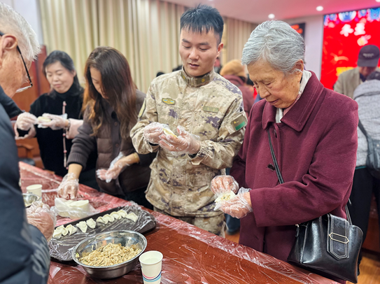 活动现场洋溢着节日的喜庆氛围。大家围坐在一起,和面、擀皮、调馅、包饺子,动作娴熟,配合默契。在温馨的互动中,老兵们分享着曾经的军旅故事,年轻一代聆听着峥嵘岁月的回忆,浓浓的情谊随着饺子的香气弥漫开来。这些饱含心意的饺子送至食堂下锅,立马为大家烹制出一份暖心的冬至餐。与此同时,来自共建单位和拥军企业志愿者们又来到烈属家中为他们送上热气腾腾的饺子和党和政府的关怀。